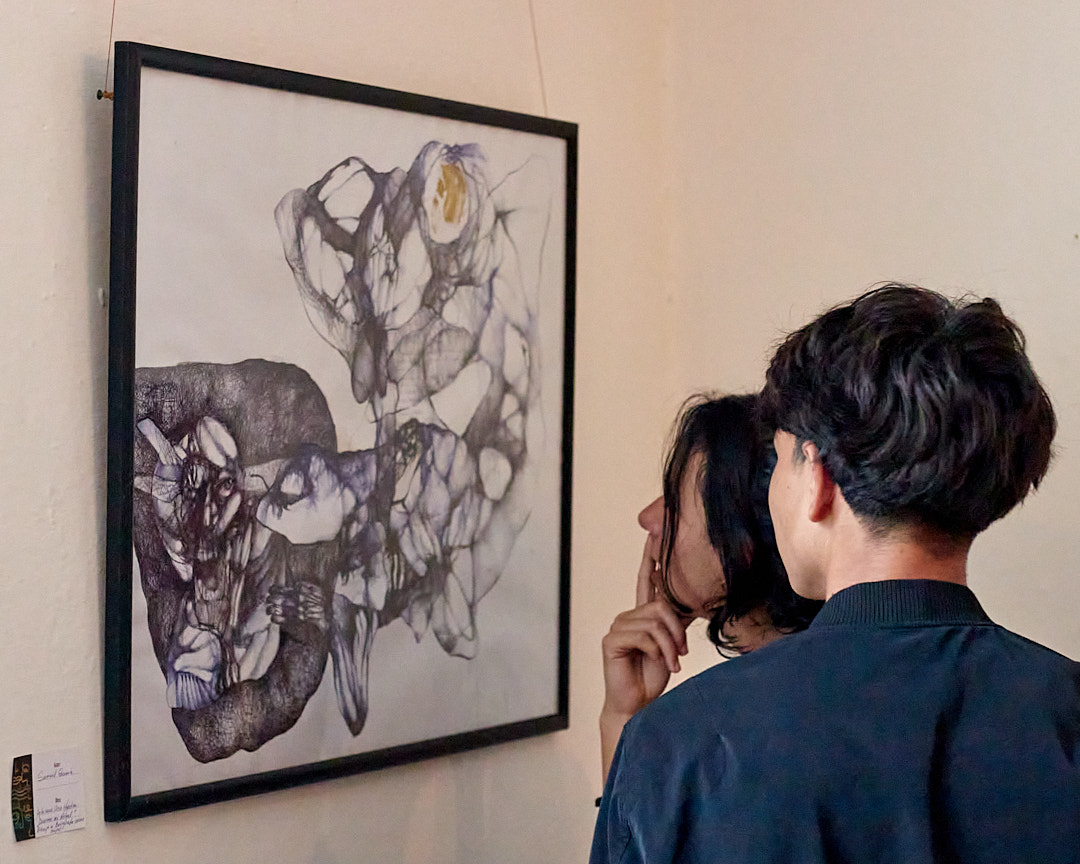 El Segundo Premio lo mereció Samuel García Velazco, por Duerme mi ángel, obra que destaca por una investigación formal centrada en la línea como estructura orgánica y generadora de volumen. A partir de una trama de grafismos entrelazados, el artista construye figuras en tensión que oscilan entre lo anatómico y lo abstracto, produciendo una imagen ambigua y abierta a múltiples lecturas.