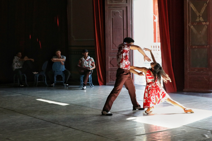 El cuadro abre con un solo de guaguancó interpretado por el joven Javiel Cisneros, reciente graduado de danza, cuya energía y organicidad marcan desde el inicio el tono de la pieza. Su presencia forma parte de esa nueva generación que, como reveló la propia directora, aportó activamente al proceso creativo, incluso guiando a bailarines de formación clásica —y a la misma Lisandra— en la comprensión de los códigos del movimiento popular.