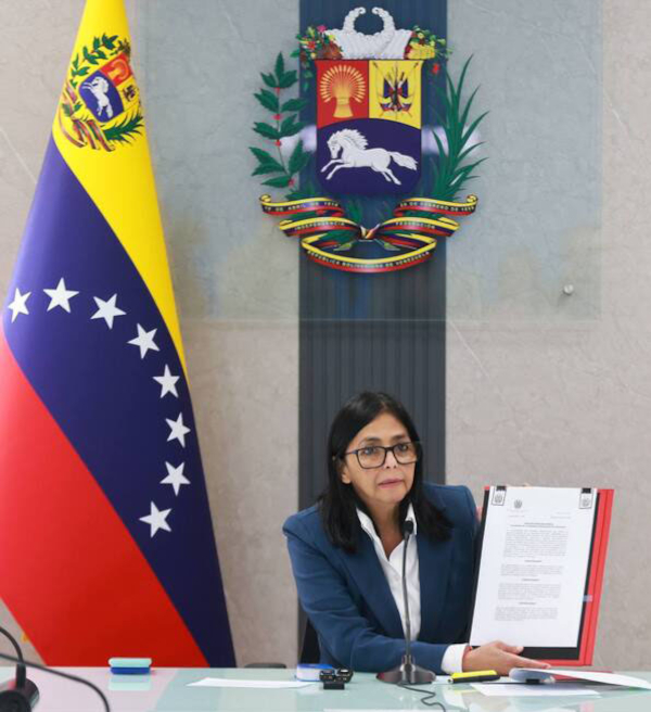 En trasmisión nacional de radio y televisión, la vicegobernante anunció la activación del decreto del Estado de conmoción suscrito por el mandatario tras la amenaza de agresión imperialista, que entregó para su entrada en vigencia inmediata a la presidenta del Tribunal Supremo de Justicia.