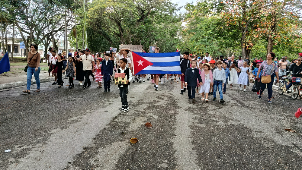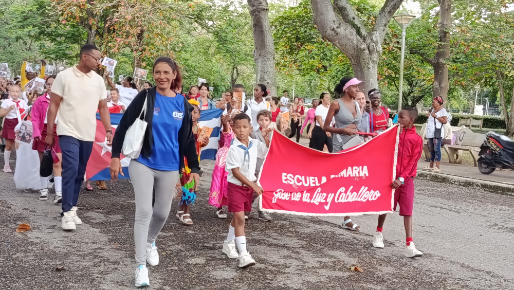 Estudiantes de más de 20 escuelas de los distritos Julio Antonio Mella y Cándido González, como la Inés Luaces, la Noel Fernández, la José Luis Tasende y la Renato Guitart, acudieron a la cita para recordar al autor de los Versos Sencillos disfrazados de personajes de La Edad de Oro, además de fotos, lemas y poesías alegóricas a su figura y a la de Fidel.
