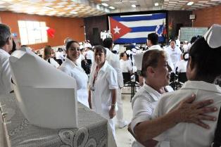Todos, unidos como en una sala de cuidados intensivos, o en la Atención Primaria de Salud, o como docentes en las aulas o diferentes servicios, terminaron con el Himno de la Enfermería Cubana, con versos de Ángela Garrido Veria, música de Olga Black y orquestación de Mario Romeo.