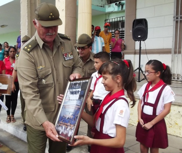 The Hero of the Republic of Cuba, Colonel Orlando Cardoso Villavicencio, delivered a replica of the Granma yacht and the diploma that certifies the triumph to Marianna, student of 4th grade of the elementary school Conrado Benitez, of the city of Camagüey.