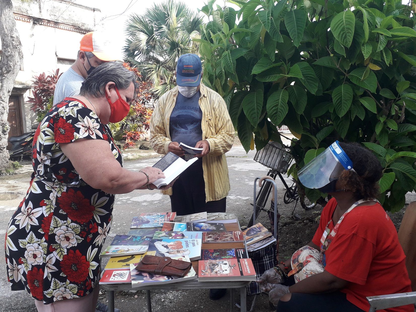 Los pacientes a la espera de la señal de su médica de la familia ocupaban las sillas tapizadas con vinil azul, que de seguro pertenecen al juego de comedor de algún vecino. En el barrio colaboran con lo que tienen, por ejemplo, de la casa número 208 es la mesita y el taburete usados para el punto de venta de libros. Otro presta su equipo de audio para la sesión vespertina, cuando termina el turno del técnico de sonido Ernesto Moreno Pérez, contratado por el Centro Provincial del Libro y la Literatura.