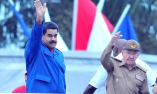 La Habana.- El General de Ejército Raúl Castro Ruz, Primer Secretario del Comité Central del Partido y Presidente de los Consejos de Estado y de Ministros, y Nicolás Maduro Moros, presidente constitucional de la hermana República Bolivariana de Venezuela, quien nos honra con su presencia en la magna fiesta de los trabajadores cubanos, presiden el multitudinario desfile por el 1ro. de Mayo en la Plaza de la Revolución José Martí, iniciado en La Habana a las 7 de la mañana.