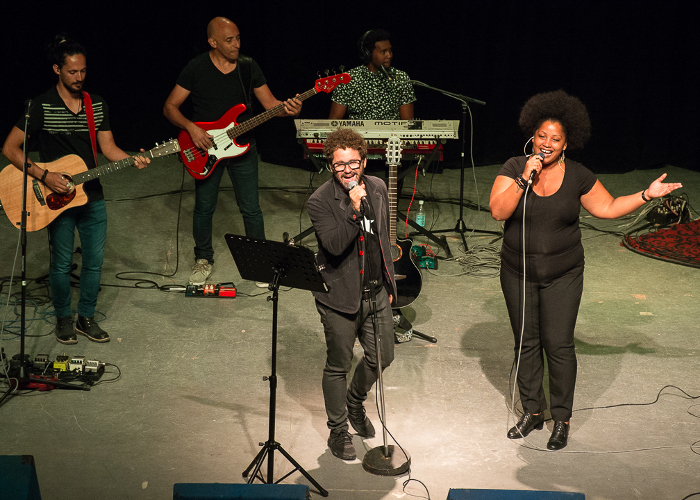 Antes del concierto, trovadores y estudiantes de teatro de la Academia de las Artes Vicentina de la Torre rindieron homenaje al Movimiento de la Nueva Trova, a propósito del aniversario 50 de su primer concierto en Casa de las Américas.