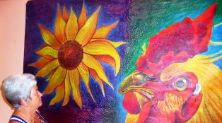 Machuty manifestó a la prensa que en la expo confluyen nuevos elementos para enriquecer su trabajo como el girasol, el caracol y el gallo, animal este último símbolo de defensa de lo que considera suyo y característico del campo cubano.