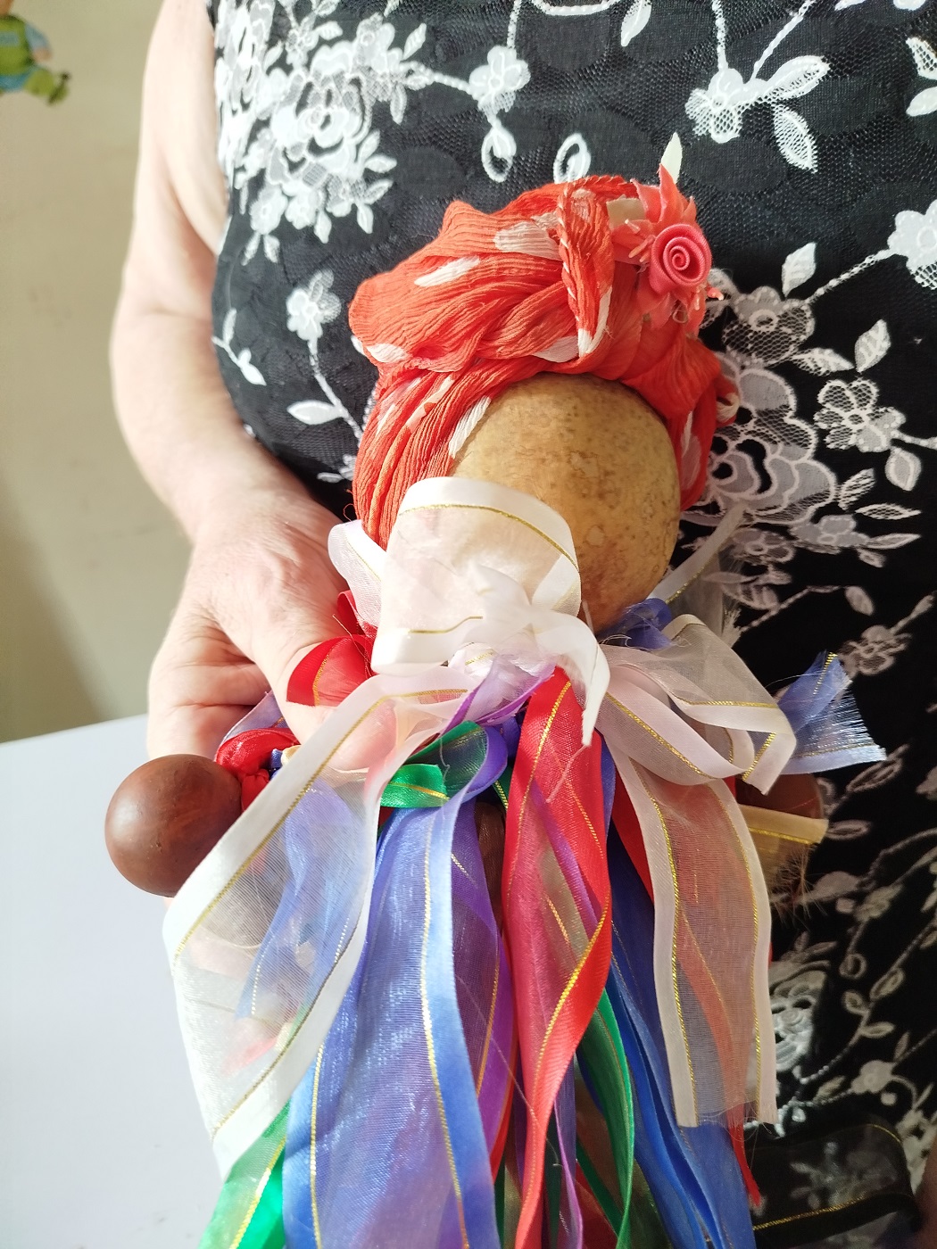 Carmen rastreó su historia en testimonios orales, en comunidades del oriente del país, en Holguín, y hasta en Colorado, Sierra de Cubitas, donde un anciano le describió cómo se hacía. “No es solo amarrar y ya. Lleva nudos hacia delante y hacia atrás para acolchonarla, semillas dentro, la cruceta de madera, la güira en la cabeza. Todo tiene un porqué”, cuenta.