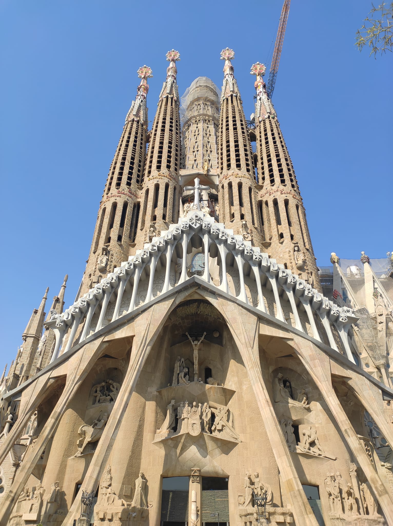 En la fachada de la Pasión, sobre las columnas que flanquean la entrada, se encuentran inscripciones que evocan la liturgia celestial: Alabanza,Gloria, Sabiduría, Acción de Gracias, Honor, Poder y Fuerza. Estas palabras, tomadas del Apocalipsis, se tallan en piedra con una caligrafía que parece resonar con la solemnidad del lugar. Cada término se convierte en un eco de lo divino, un recordatorio de la espiritualidad que impregna cada rincón del templo.