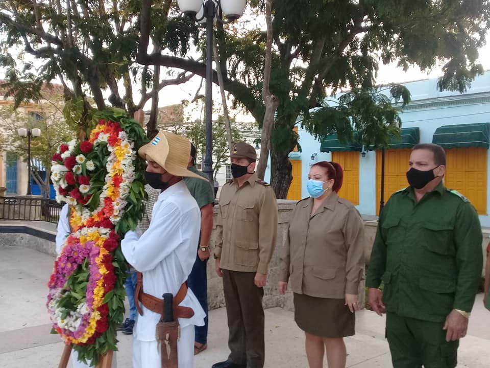 Desde la intimidad a que obligan las medidas de prevención frente al SARS-CoV-2, las flores en nombre de todos los cubanos honraron su estatua ecuestre, colocadas por Ariel Santana Santiesteban y Yoseily Góngora López, presidente y vicepresidenta del Consejo de Defensa Provincial, respectivamente.