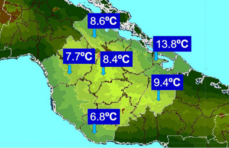En la ciudad de Camagüey, se registró 8.4°C, Esmeralda 8.6°C, la estación meteorológica de Palo Seco, en Guáimaro, indicó 9.4°C, y la de Nuevitas 13.8°C, publicó la institución a través de sus perfiles en redes sociales.