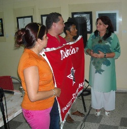 "Si en una institución cultural camagüeyana hay potencial humano, unidad, coherencia y resultados en el trabajo; si en un lugar se piensa a conciencia la oferta artística de cada día y se ofrece con calidad y esmero, es aquí, en esta Casa que hoy nuestro sindicato abandera simbólicamente"- reconoció Nereida Pérez Labrada, secretaria general del Sindicato Nacional de Trabajadores de la Cultura, al entregar la enseña al actual presidente de la AHS en Camagüey, Yunielkis Naranjo Guerra.