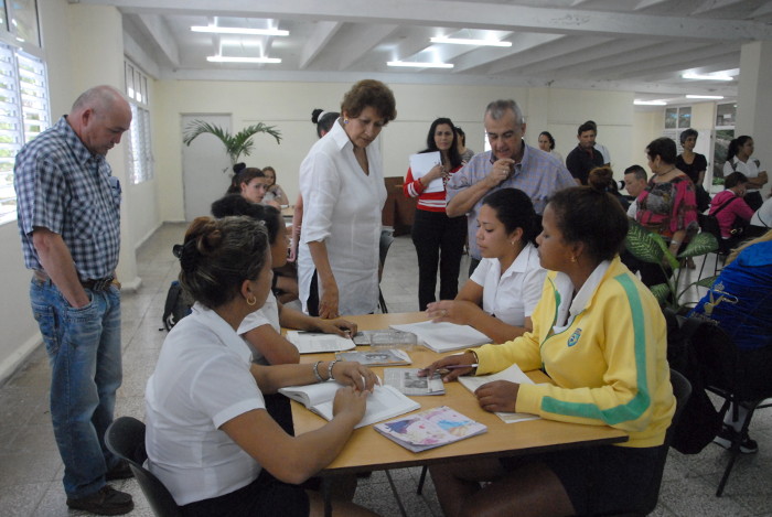 CAMAGÜEY.- Ena Elsa Velázquez Cobiella, ministra de Educación, intercambió este viernes con alumnos de la escuela pedagógica Nicolás Guillén, como parte de una visita especializada a la provincia. En el diálogo insistió en cuán vital resulta la autopreparación en su formación como futuros docentes; con especial énfasis en el dominio y adecuado empleo de las nuevas tecnologías, campo en el que el Ministerio invierte cuantiosos recursos.
