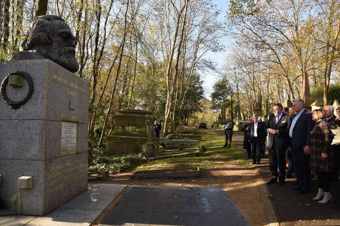 El mandatario de la isla, quien realiza una visita de tránsito a Reino Unido tras una gira internacional, visitó este miércoles la tumba de uno de los padres del socialismo científico en el afamado camposanto de la capital británica.