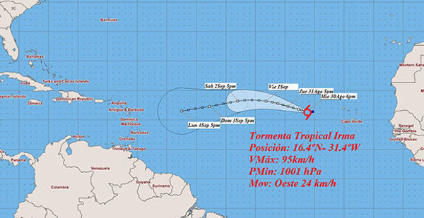 Irma se mueve hacia el oeste noroeste a cerca de 19 kilómetros por hora. Se espera un giro hacia el oeste esta noche, seguido mańana de otro movimiento hacia el oeste suroeste.